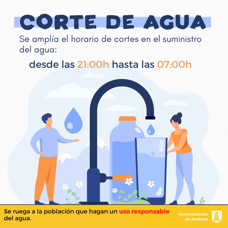 El Alcalde de Pedrera, Antonio Nogales, ha comunicado que a partir hoy se amplía el horario de los cortes de agua nocturnos en el municipio. Concretamente, el corte de agua será de Lunes a Jueves desde las 23:00h hasta las 06:00h, y desde el Viernes al Domingo desde las 00:00h hasta las 06:00h.