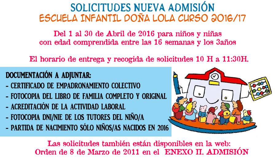 El horario de entrega y recogida de solicitudes en la Escuela Infantil Doña Lola es de 10:00H a 11:30H.