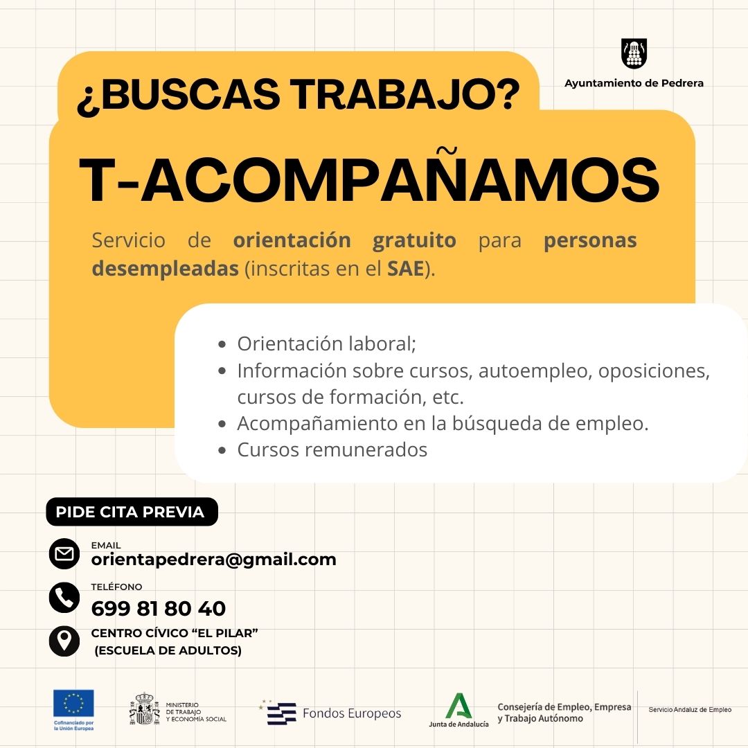 El Ayuntamiento de Pedrera va a poner en marcha el programa de acompañamiento al empleo denominado ‘Proyectos Integrales de Inserción Laboral "T-Acompañamos"’, financiado por la Junta de Andalucía y la Unión Europea a través del Fondo Social Europeo Plus (FSE+), con el objetivo de promover la inserción laboral, a través del desarrollo de proyectos integrales de acompañamiento, de las personas desempleadas.