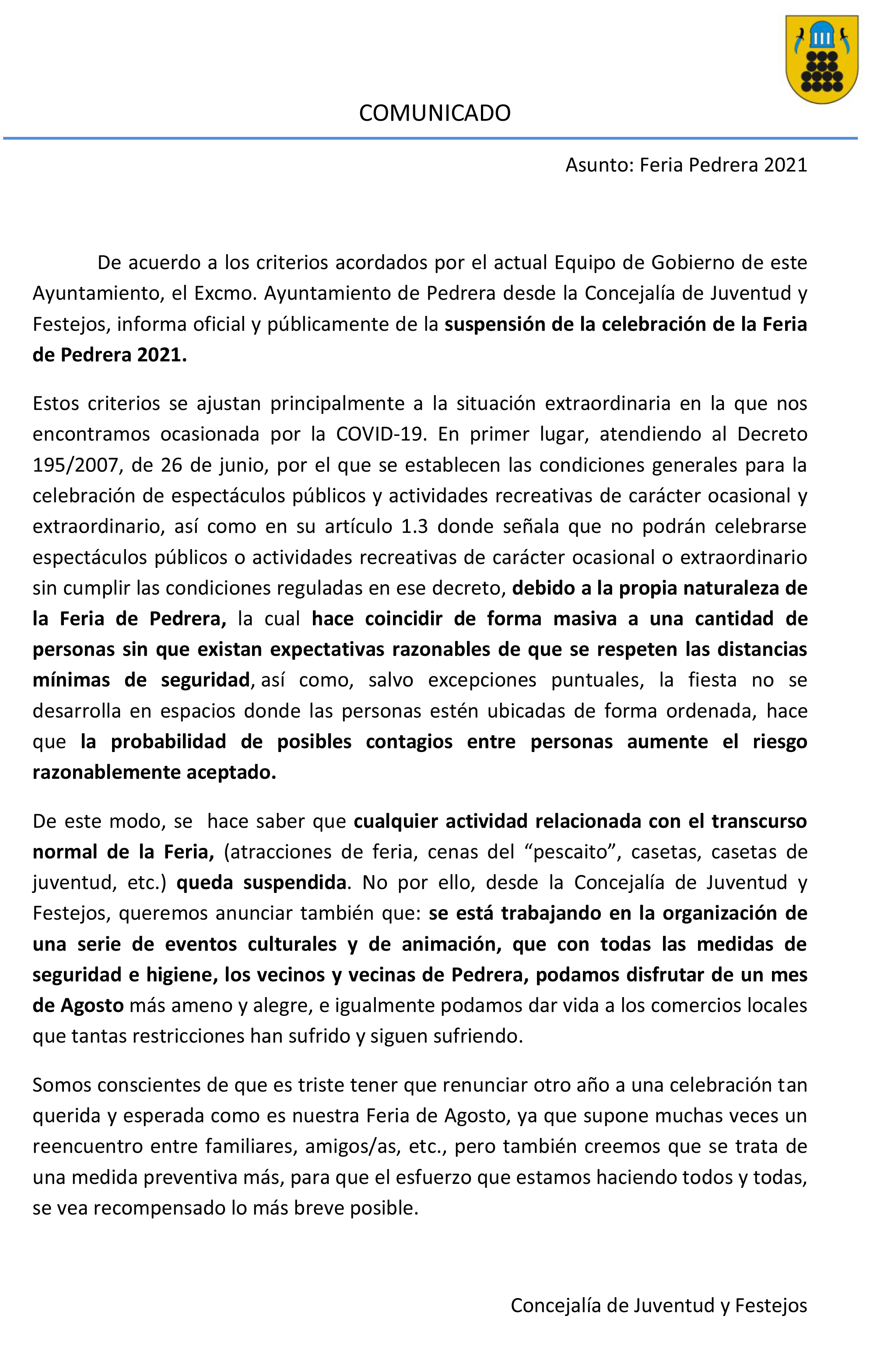 La decisión ha sido tomada en conjunto por el actual equipo de gobierno y atendiendo “al Decreto 195/2007, de 26 de junio, por el que se establecen las condiciones generales para la celebración de espectáculos públicos y actividades recreativas de carácter ocasional y extraordinario, así como en su artículo 1.3 donde señala que no podrán celebrarse espectáculos públicos o actividades recreativas de carácter ocasional o extraordinario sin cumplir las condiciones reguladas en ese decreto, debido a la propia naturaleza de la Feria de Pedrera, la cual hace coincidir de forma masiva a una cantidad de personas sin que existan expectativas razonables de que se respeten las distancias mínimas de seguridad, así como, salvo excepciones puntuales, la fiesta no se desarrolla en espacios donde las personas estén ubicadas de forma ordenada, hace que la probabilidad de posibles contagios entre personas aumente el riesgo razonablemente aceptado”.
