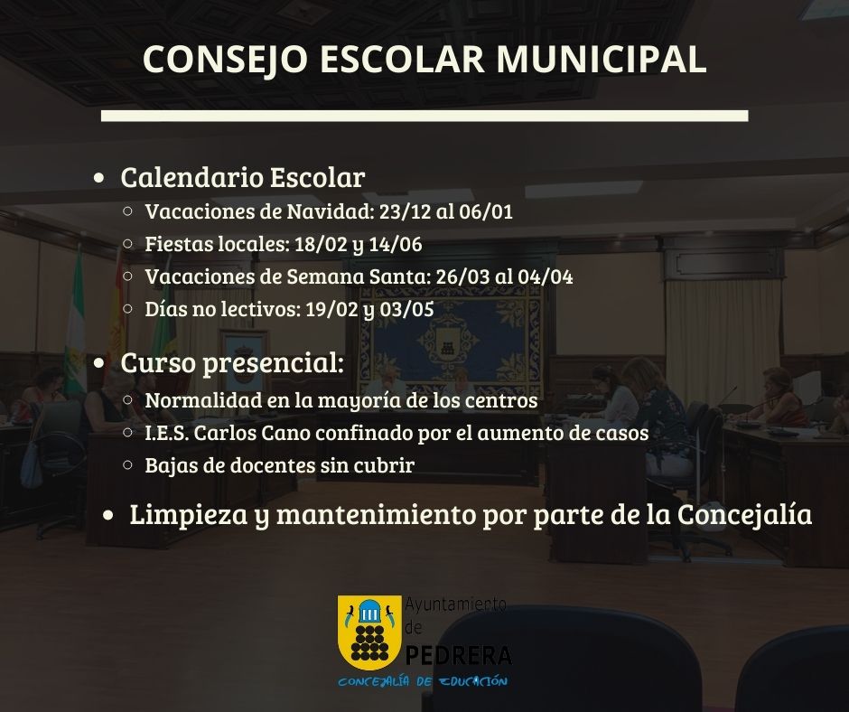 El Ayuntamiento de Pedrera celebraba el Consejo Escolar Municipal de forma telemática debido a la situación sanitaria en nuestra localidad, presidido por el Alcalde, Antonio Nogales y la Concejala de Educación y Cultura, Dolores Gordillo y en el que participan los directores/as y representantes del las AMPAS de los Centros Educativos de Pedrera.