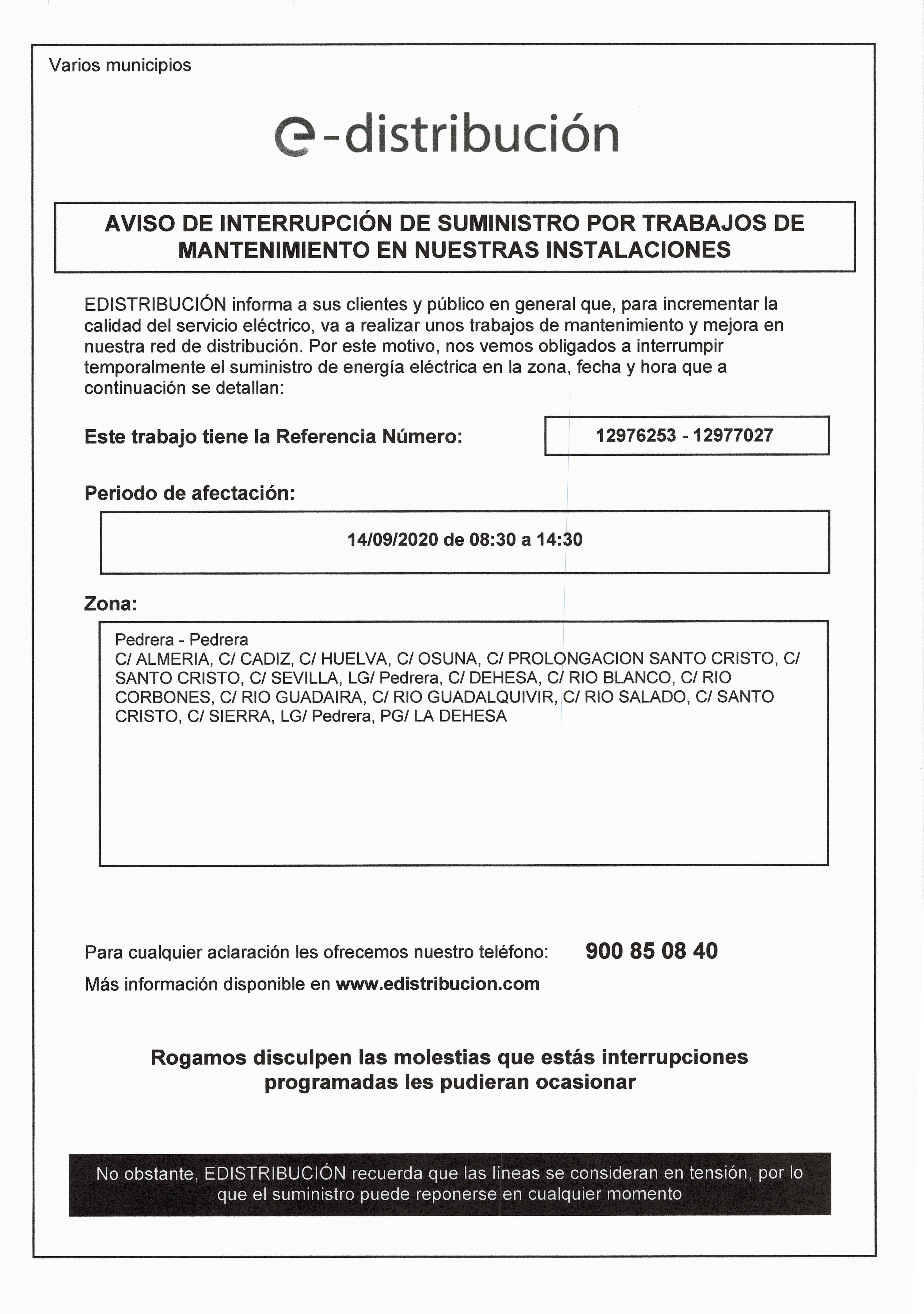 Endesa realizará trabajos de mantenimiento y mejora en la red de distribución, por lo tanto, el próximo lunes 14 de septiembre, desde las 08:30h a 14:30h, se interrumpirá el suministro de luz en la siguiente zona: