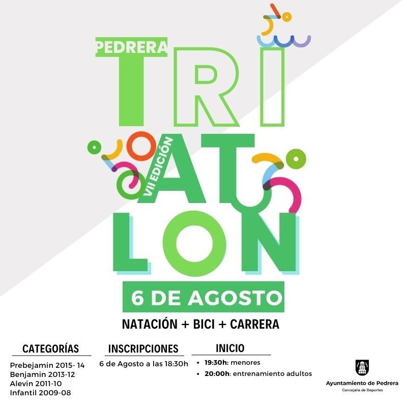 Pedrera acogerá una nueva edición del Triatlón Infantil, una prueba que abarca natación, carrera y bicicleta. La competición, tendrá lugar el sábado 6 de agosto a partir de las 19.30h en la Piscina Municipal. Las inscripciones comenzarán a las 18:30h.