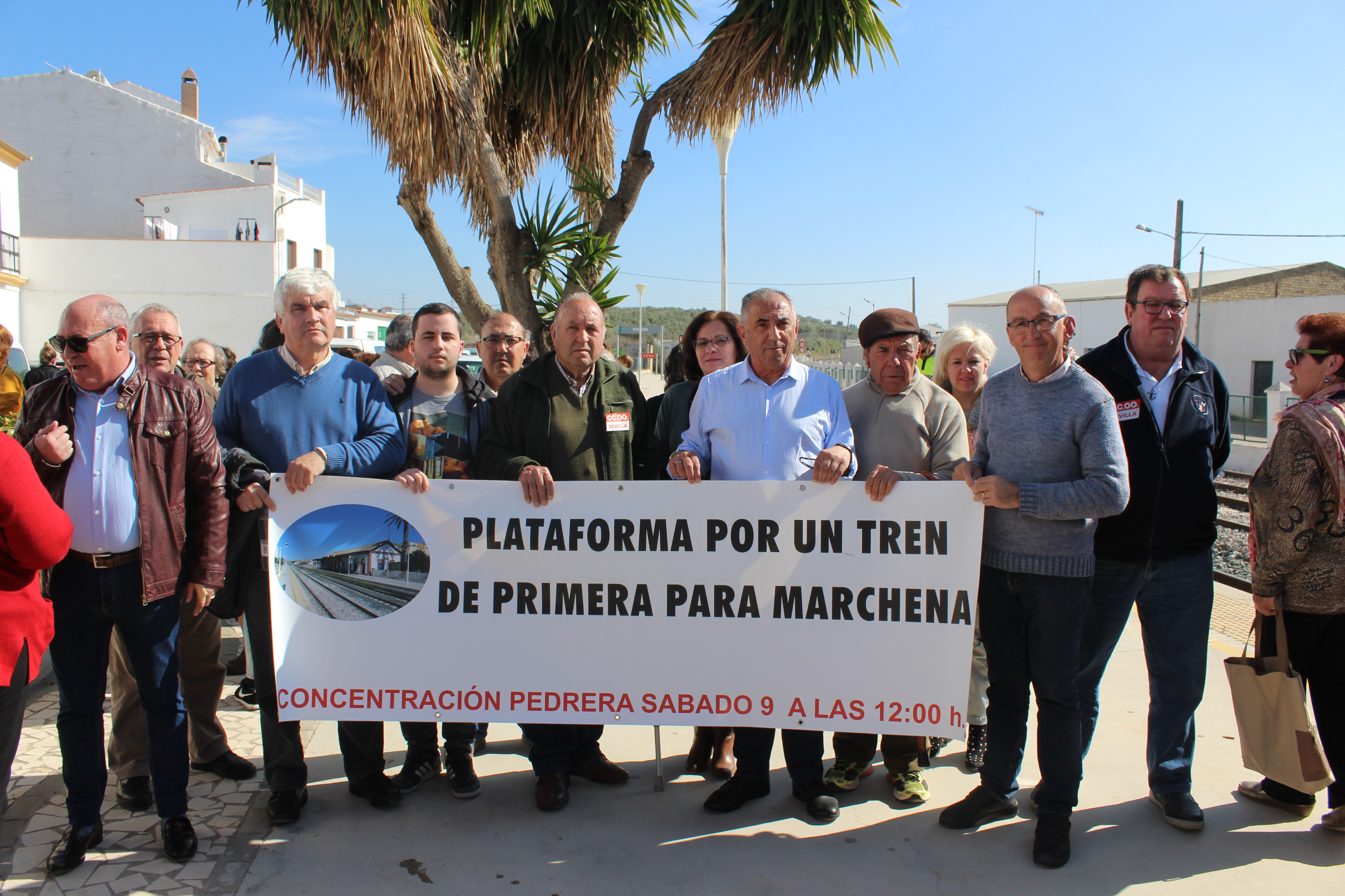 Un centenar de personas, han participaron en la concentración que tuvo lugar en el muelle de la estación de tren de Pedrera, para reivindicar una mejora en los servicios ferroviarios de la comarca, debido al deterioro que sufren las infraestructuras por la falta de inversión.