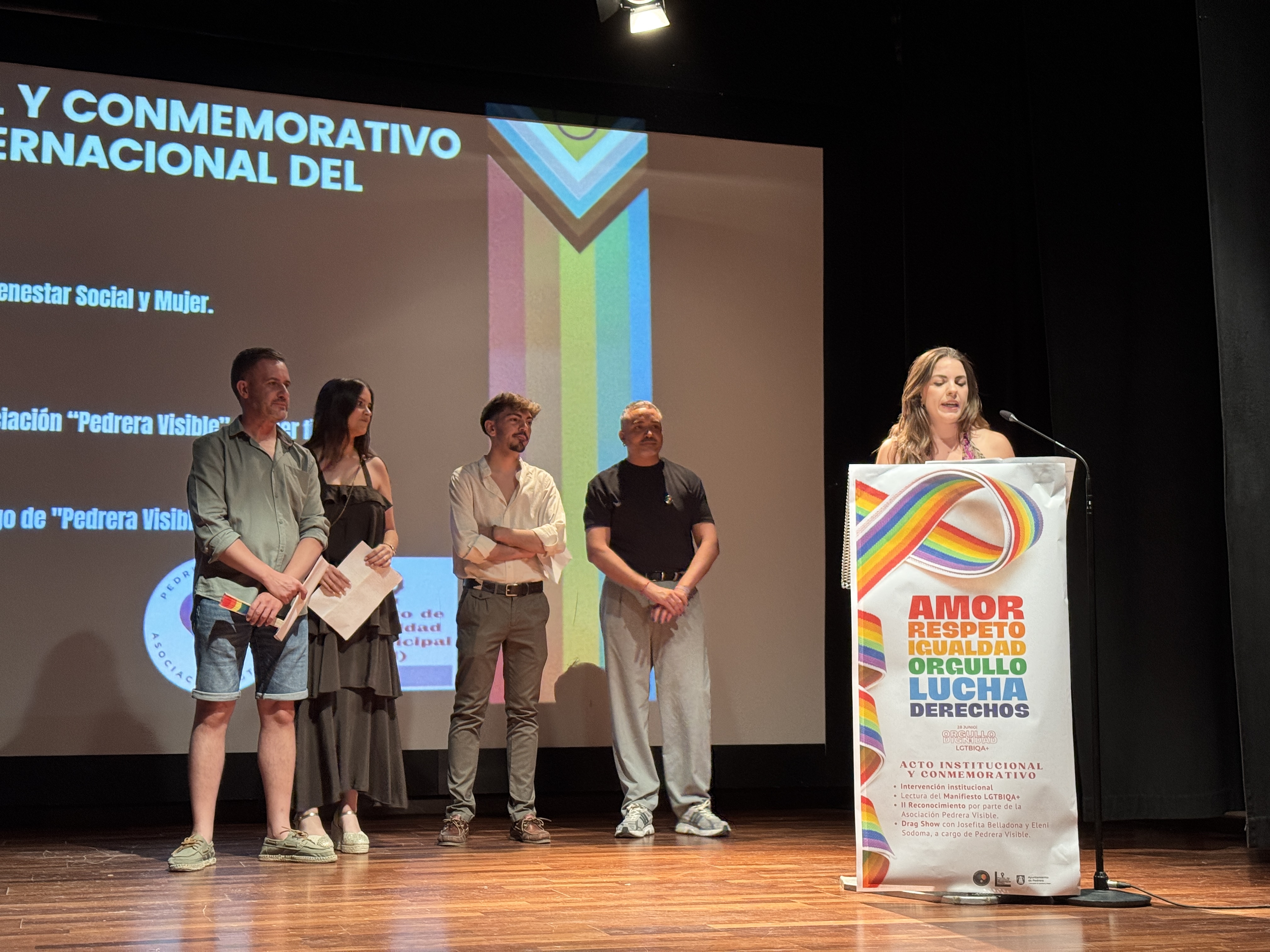 El Teatro Municipal de Pedrera ha acogido este viernes el acto institucional y conmemorativo del Día del Orgullo LGTBIQA+, una cita organizada por la Concejalía de Igualdad, Mujer y Bienestar Social, en colaboración con la Asociación Pedrera Visible, que ha reunido a vecinos, vecinas, representantes institucionales, colectivos sociales y culturales de la localidad para reivindicar una sociedad más libre, diversa y justa.