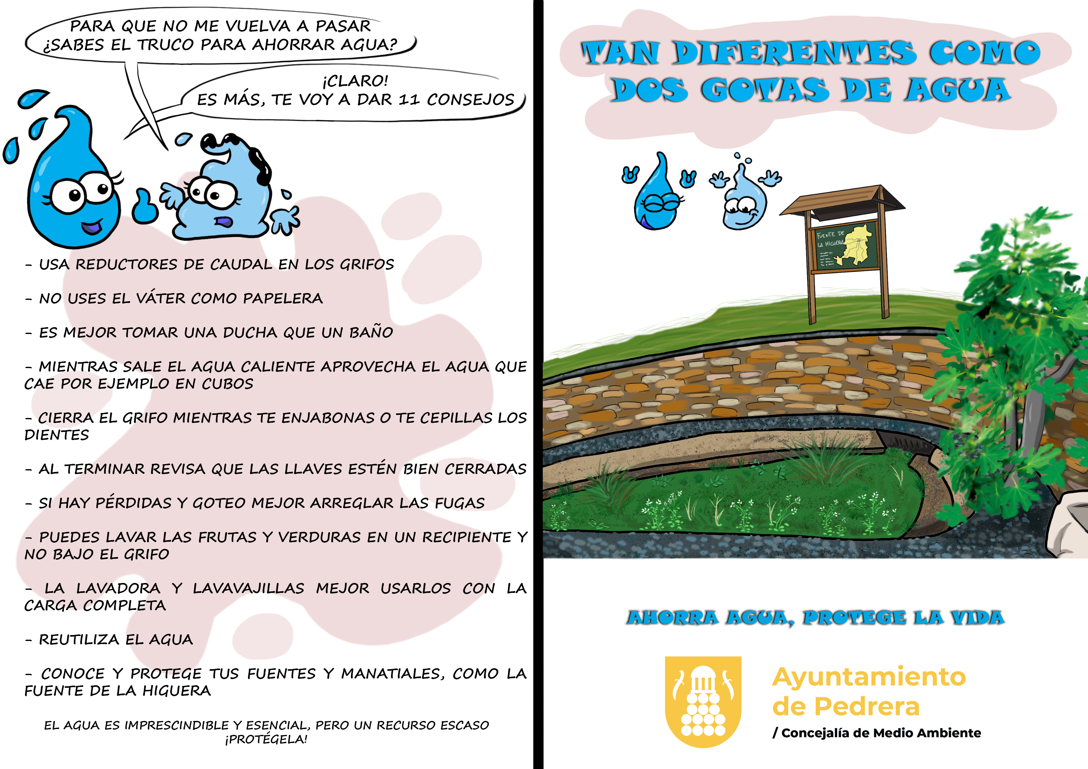 La campaña incluye el reparto de bolsas realizadas con materiales reciclados y un cómic titulado "Tan diferentes como dos gotas de agua", que se distribuirá casa por casa. El cómic narra la historia de dos gotas de agua con destinos muy diferentes: una se utiliza de manera eficiente en diversos usos, mientras que la otra es desechada irresponsablemente y termina contaminando el medio ambiente. A través de esta historia, se busca sensibilizar a la población sobre la importancia de cuidar y utilizar el agua de manera sostenible.