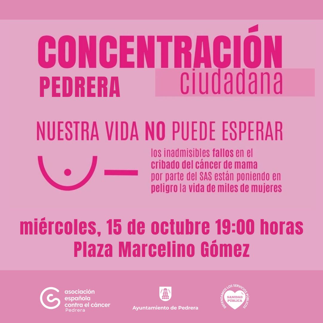La Junta local de la AECC, Marea Blanca y el Ayuntamiento de Pedrera han convocado el próximo miércoles, 15 de octubre, una concentración ciudadana en la Plaza Alcalde Marcelino Gómez, en protesta a los “inadmisibles” fallos en el cribado del cáncer de mama.