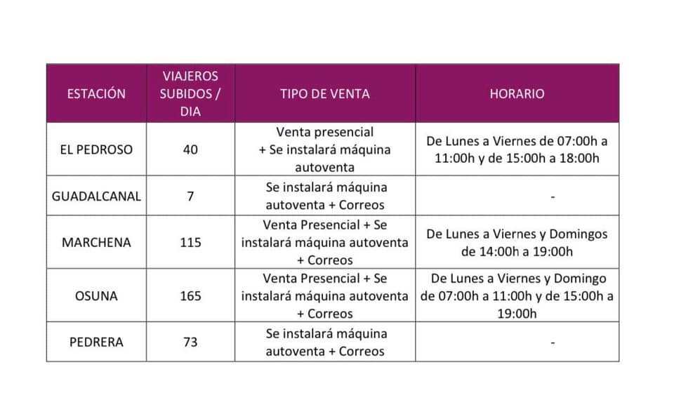 En el caso de la Estación de Pedrera, donde se registra una media diaria de 73 viajeros/ viajeras subidas, Renfe eliminará el servicio de venta presencial. De esta forma, la venta de billetes se realizará a través de un dispositivo autoventa que se instalará en la Estación, y en la Oficina de Correos.